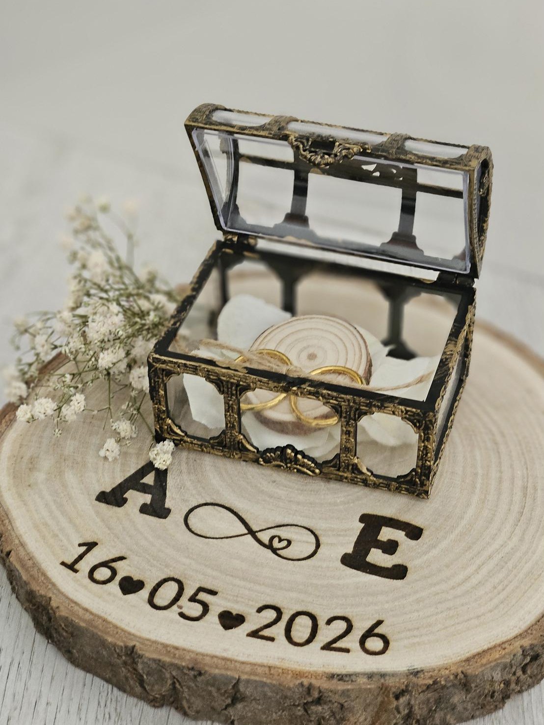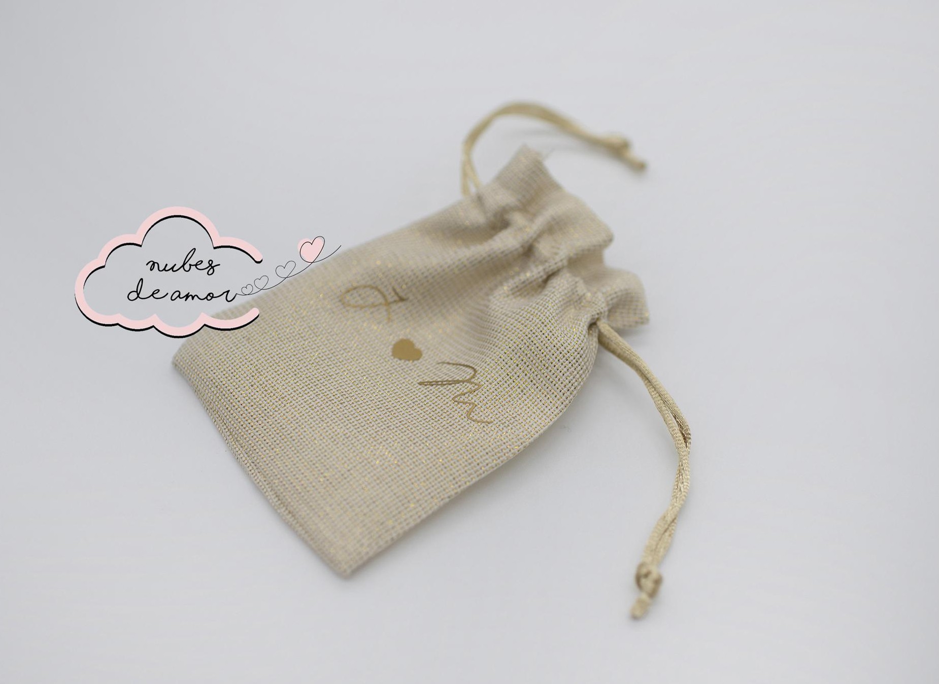 Base en acrílico blanco, con iniciales en relieve, y el texto en vinilo dorado. Se personaliza al gusto. Las alianzas cuelgan del lazo.